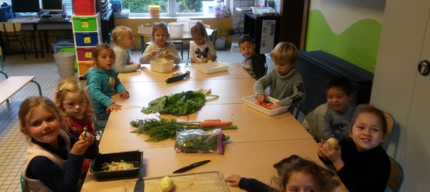 Suite à l’album « La soupe que je préfère », les enfants de maternelle décident de cuisiner la soupe préférée de Madame Marie avec les ingrédients du jardin de Madame Nathalie !